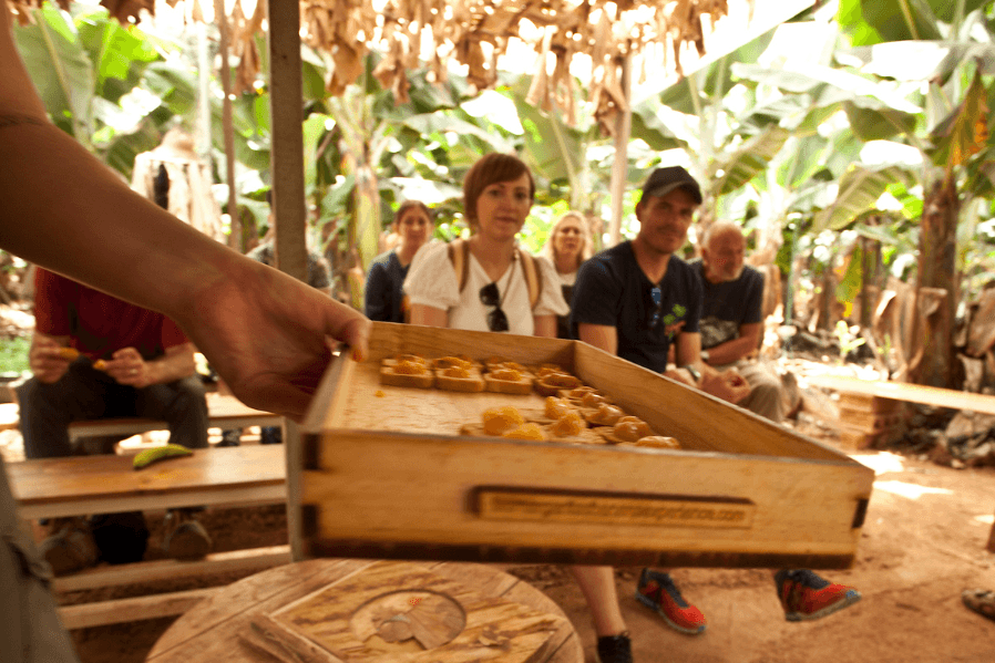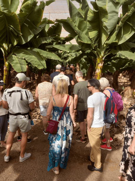La visita incluye un recorrido por la plantación, una explicación sobre el cultivo de plátanos, una degustación de productos locales, como mermeladas y dulces de plátano, y una demostración de la elaboración de gofio.